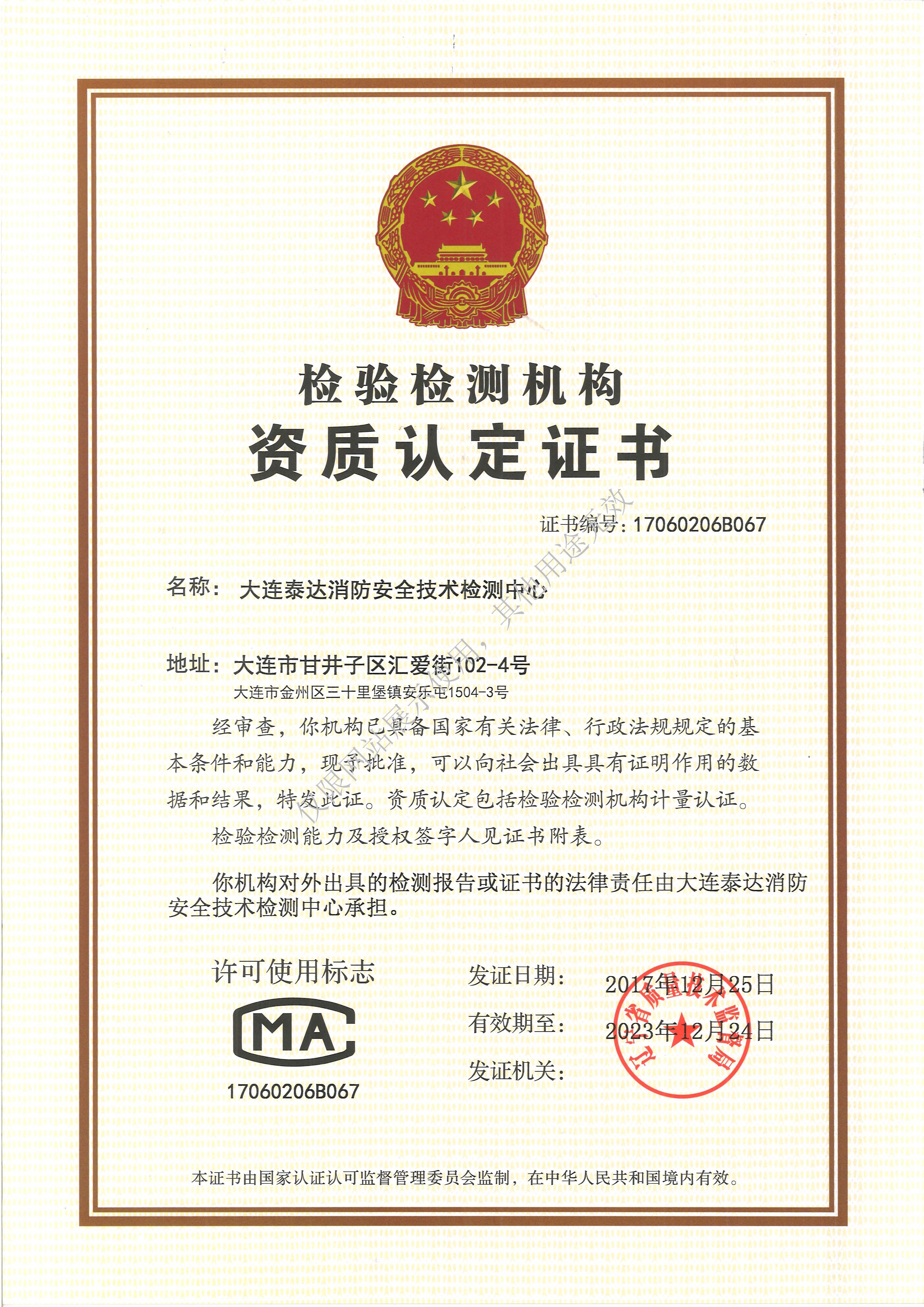 · 大連泰達消防安全技術檢測中心成立于2003年3月,是一家專注從事消防設施維護保養、消防設施檢測、電氣防火檢測、消防安全評估、雷電防護裝置檢測、防火涂料檢測、消防技術咨詢與消防培訓等專業消防技術服務的企業。